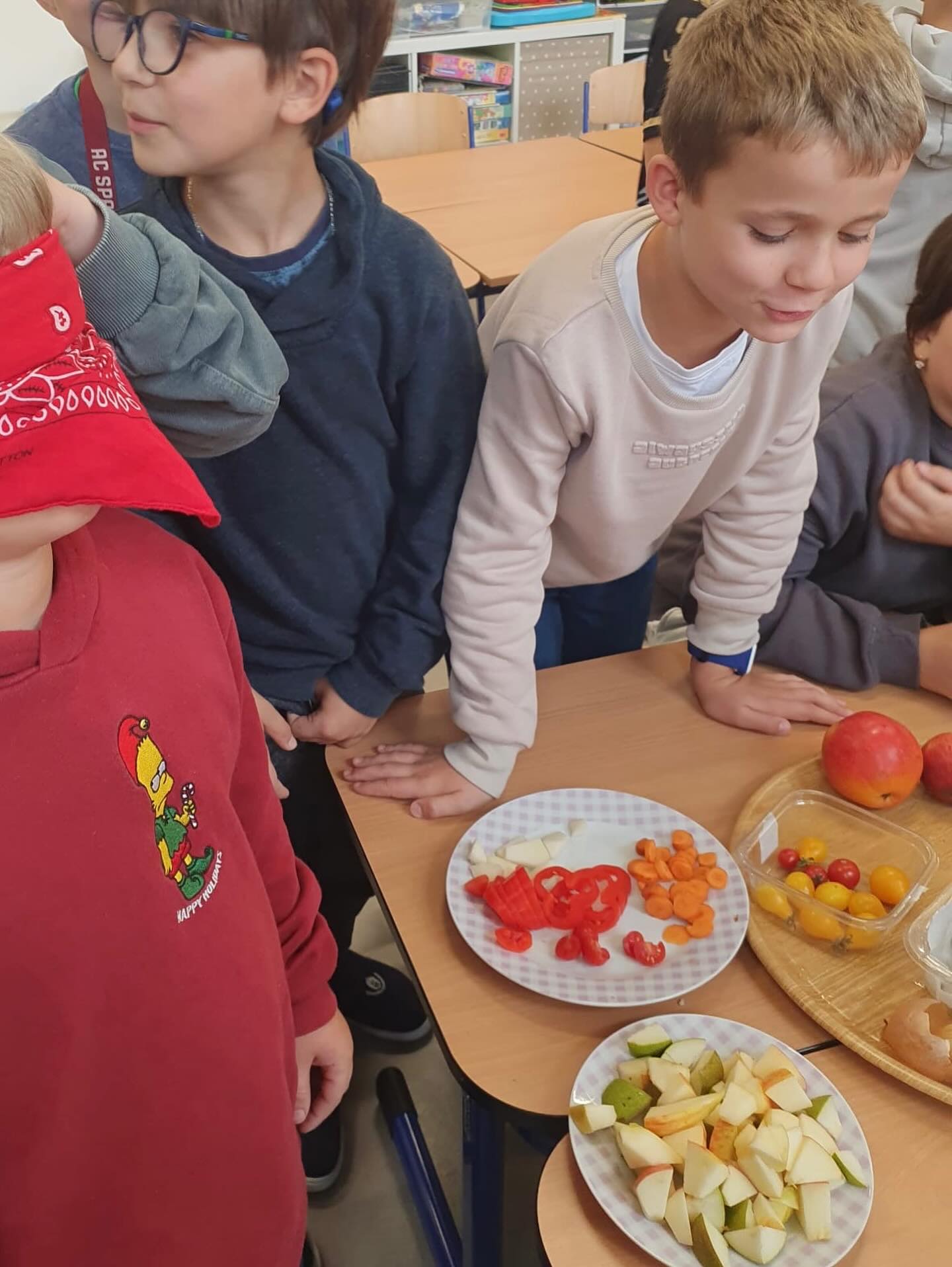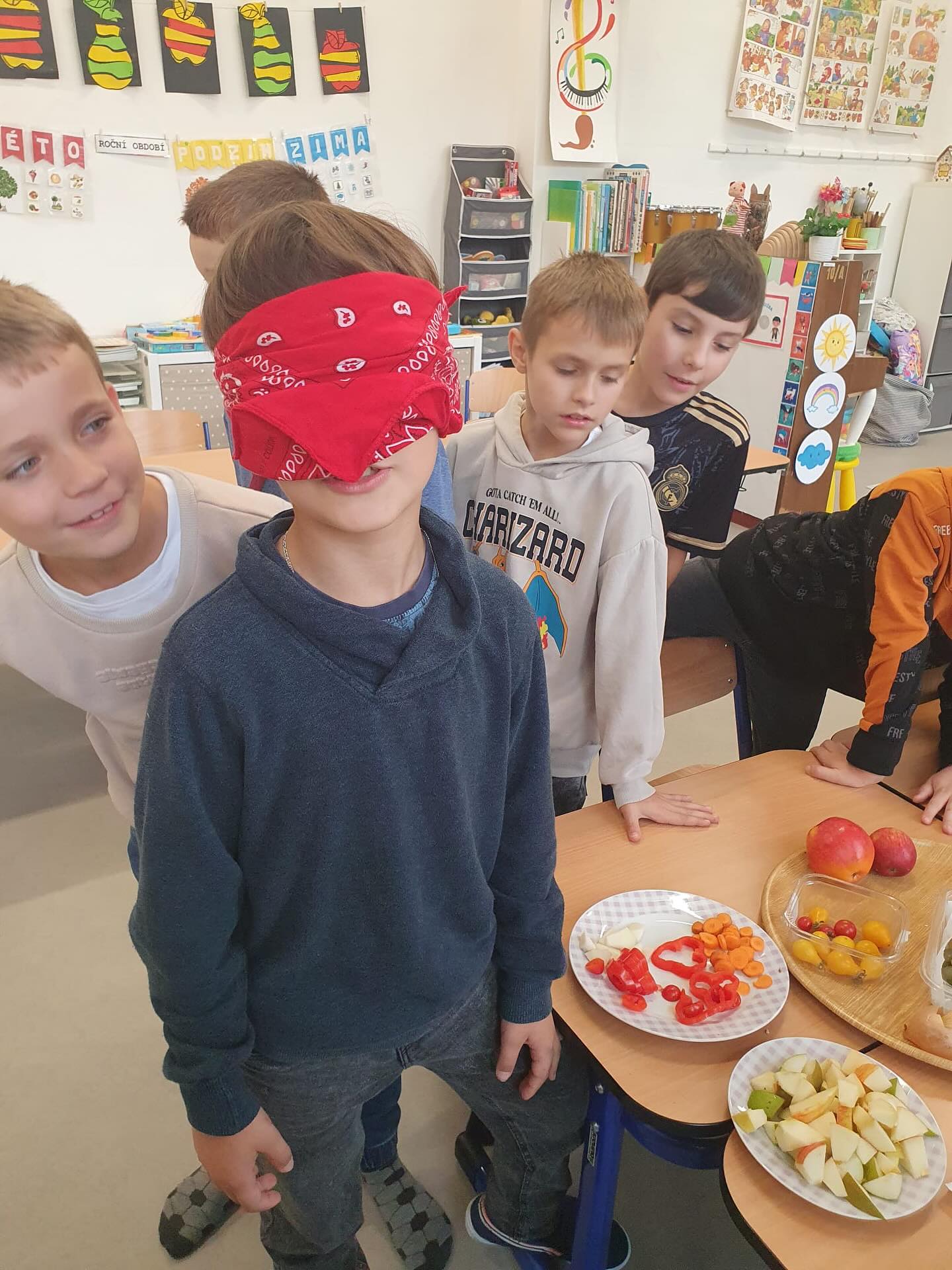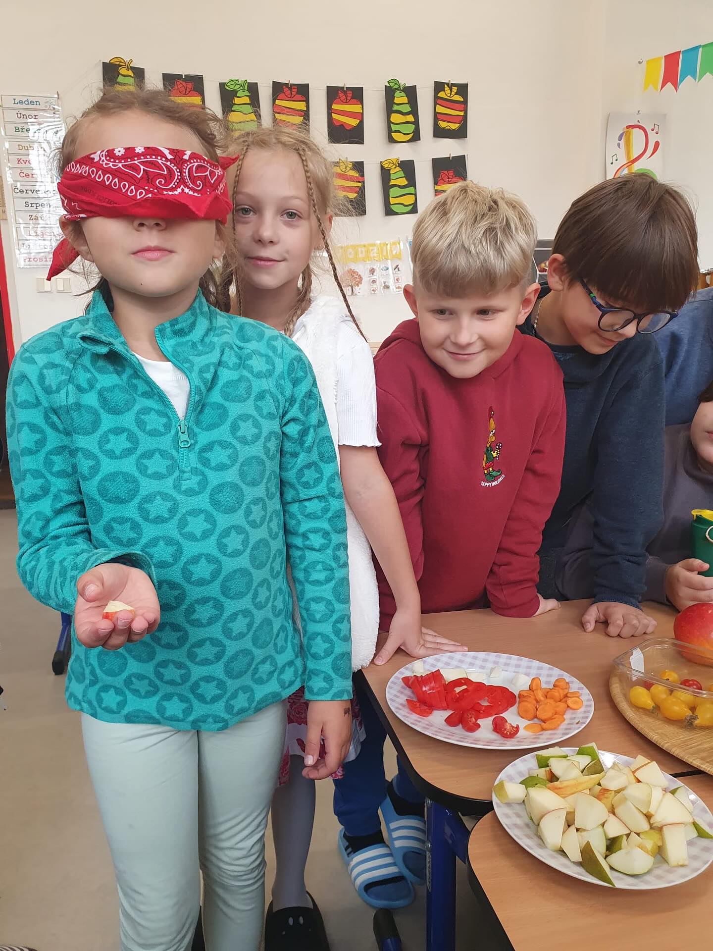 Týden jsme zahájili výstavkou ovoce a zeleniny, kde si žáci mohli prohlédnout a pojmenovat různé druhy plodů. Hráli jsme si na obchod, povídali si o vitamínech a zdravém stravování a tvořili podzimně laděné obrázky a výrobky. Velkým zážitkem byla ochutnávka ovoce a zeleniny poslepu, která žáky velmi bavila.