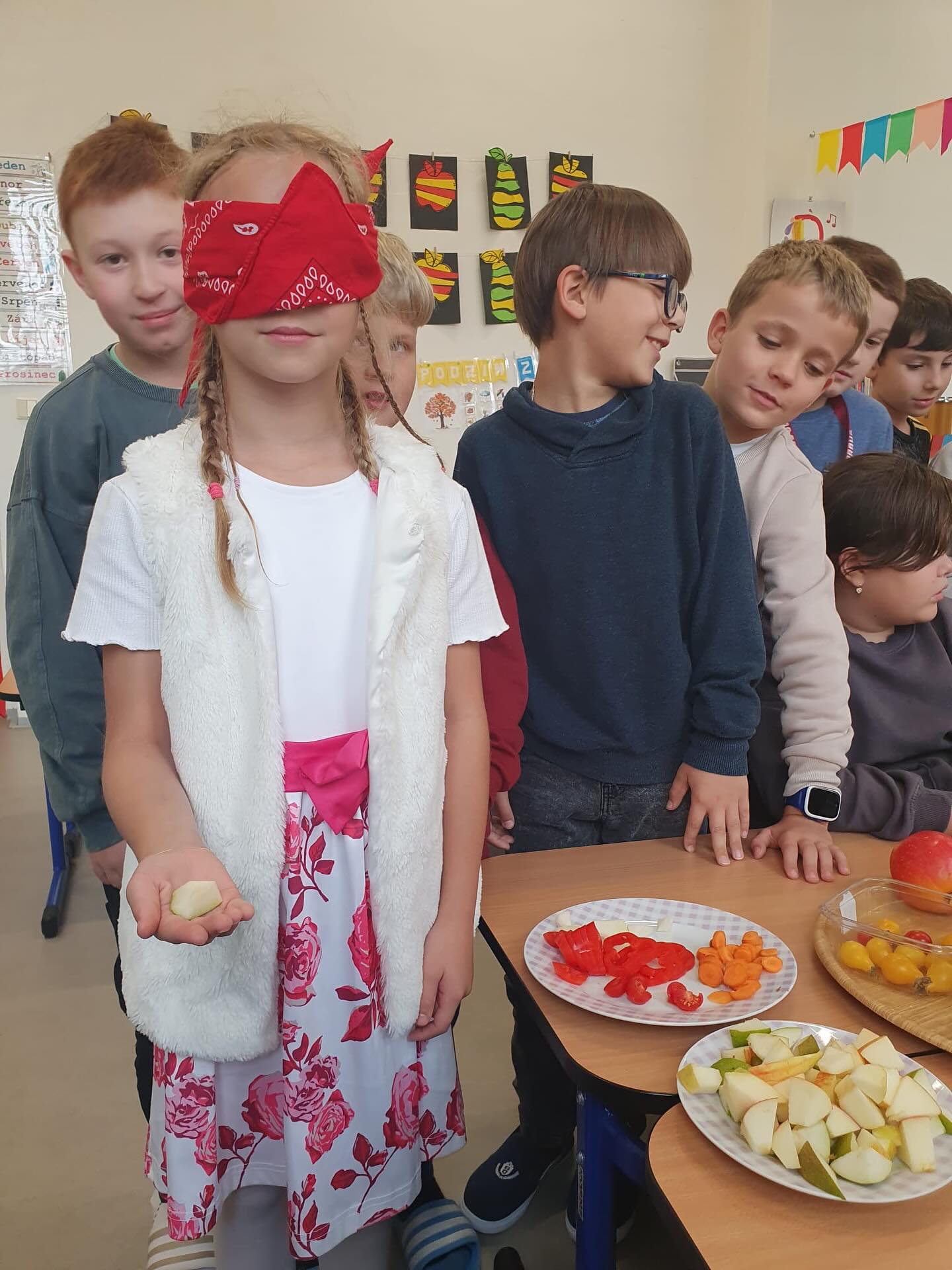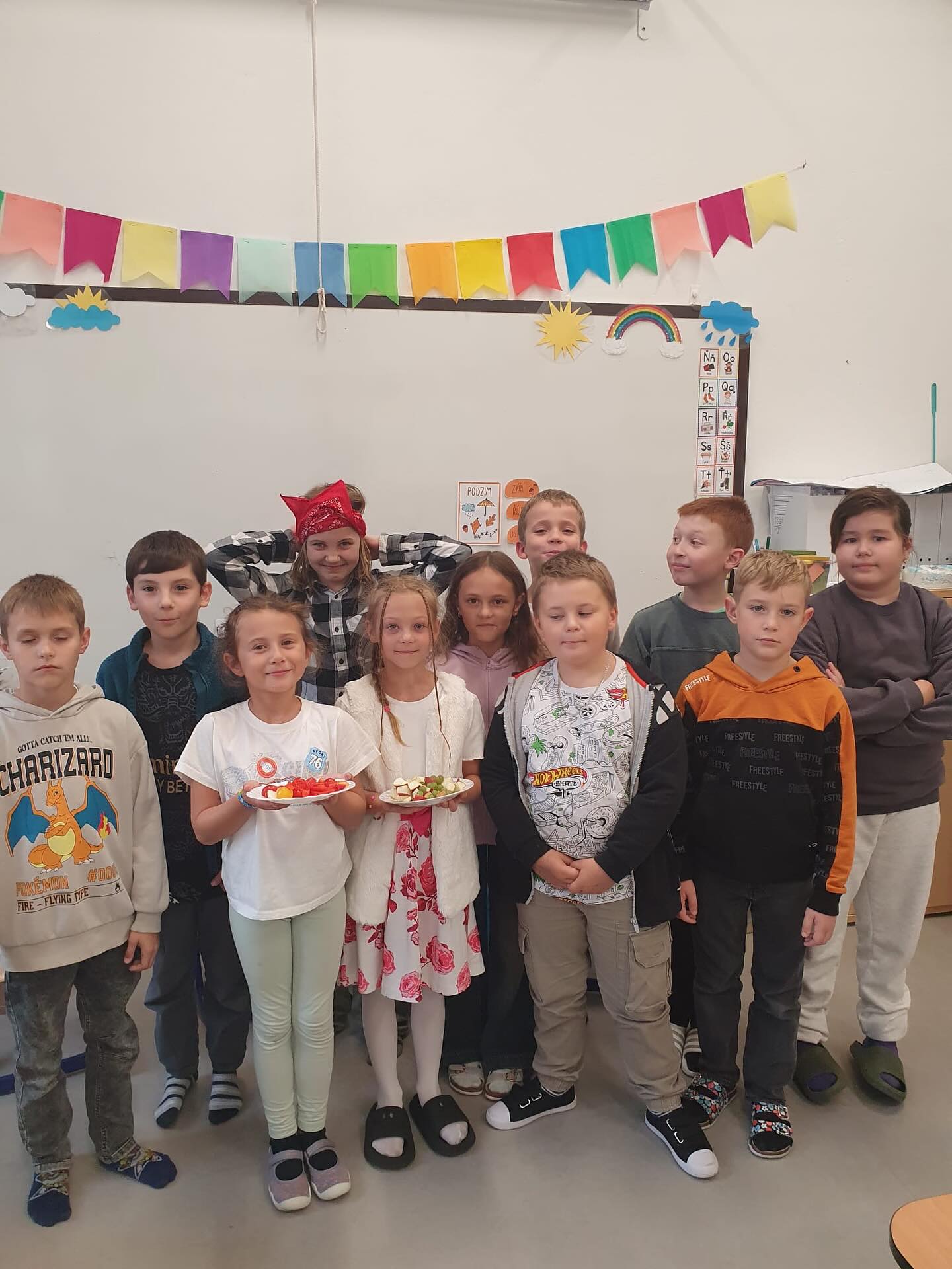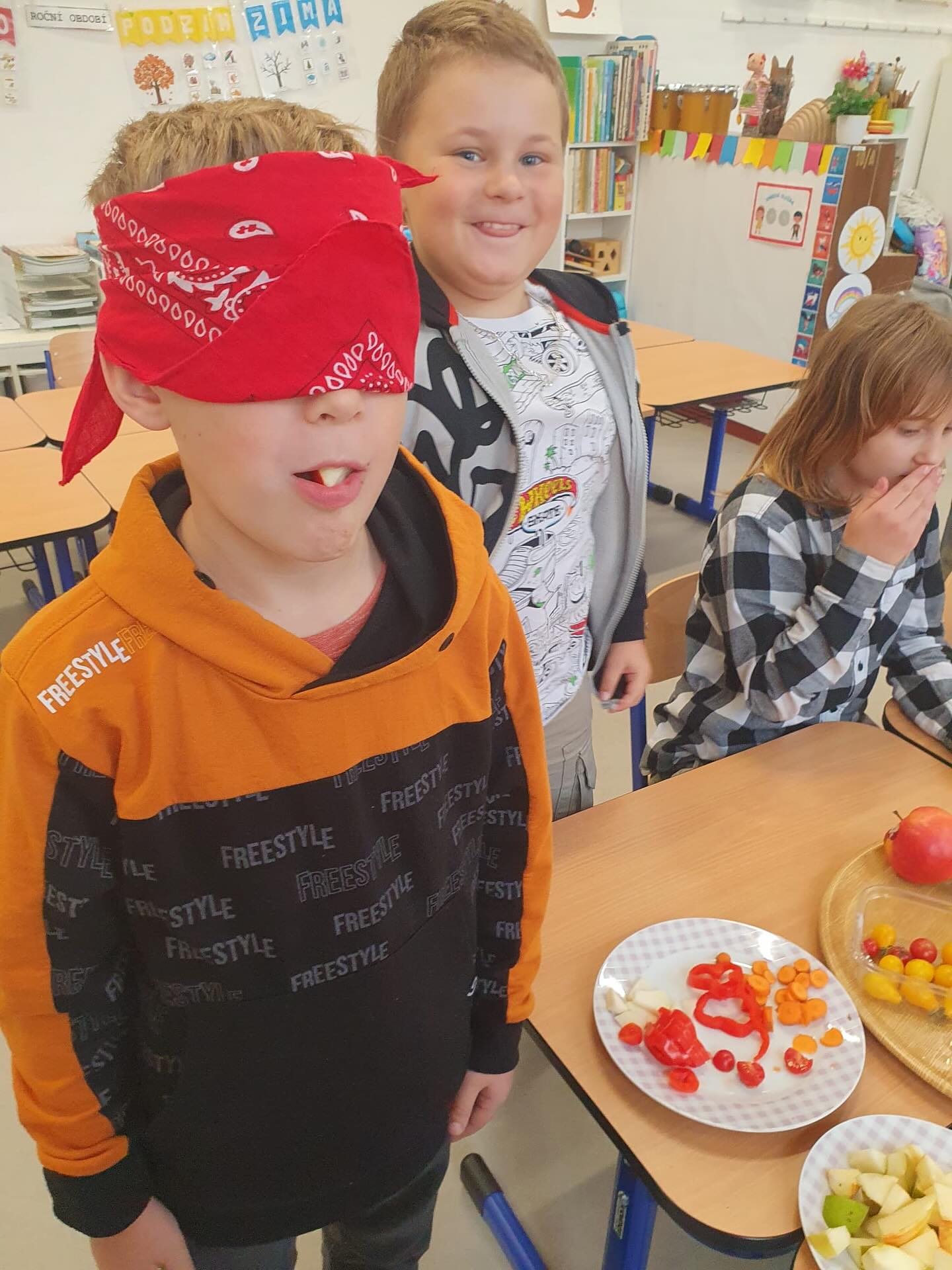 Týden jsme zahájili výstavkou ovoce a zeleniny, kde si žáci mohli prohlédnout a pojmenovat různé druhy plodů. Hráli jsme si na obchod, povídali si o vitamínech a zdravém stravování a tvořili podzimně laděné obrázky a výrobky. Velkým zážitkem byla ochutnávka ovoce a zeleniny poslepu, která žáky velmi bavila.