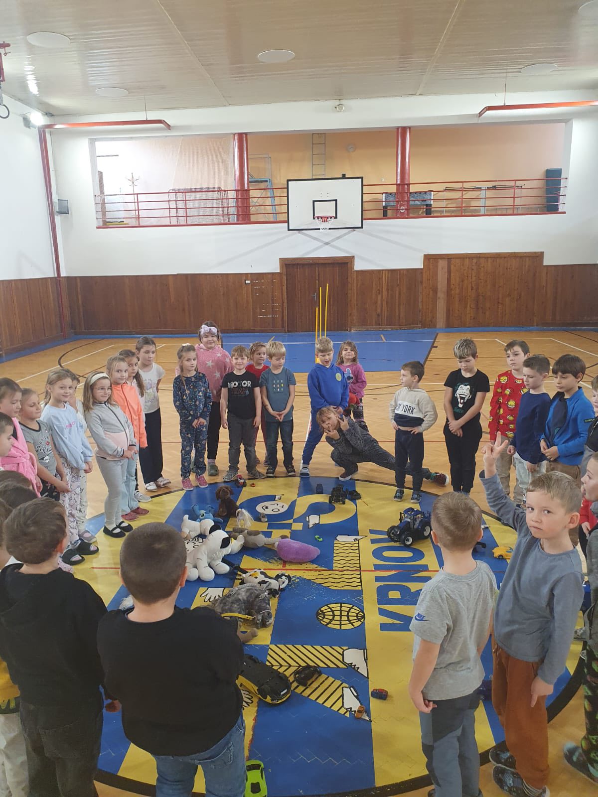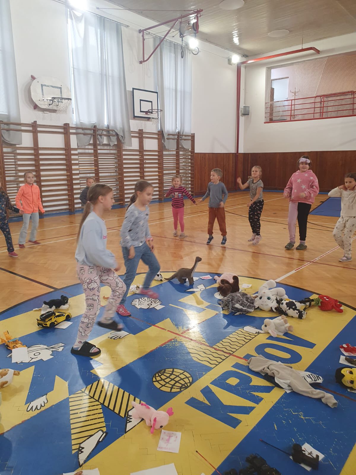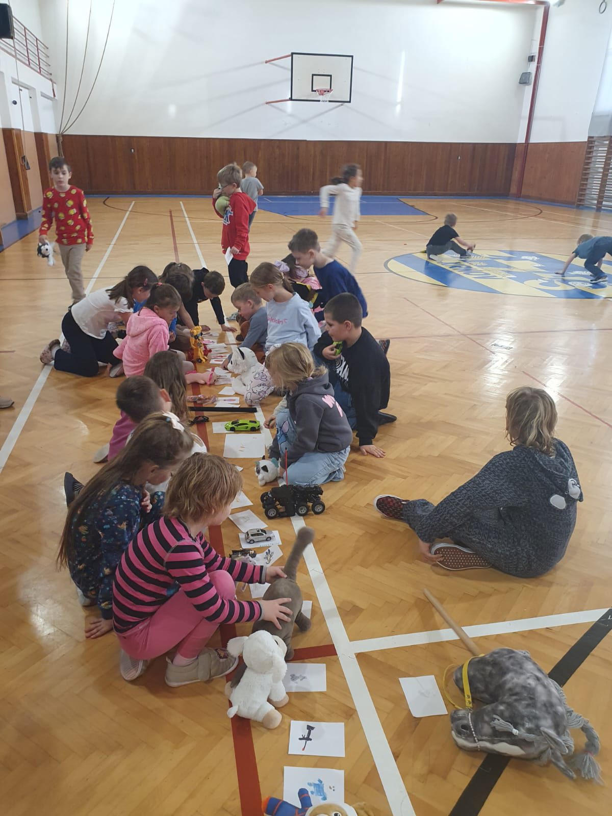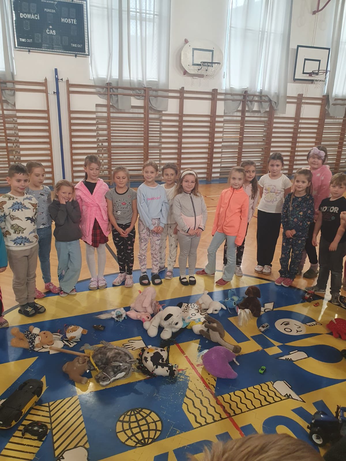 V tělocvičně nejprve své hračky představili a potom s nimi soutěžili, plnili úkoly, kreslili a tančili. Žákům se tato akce velmi líbila. ![]()
