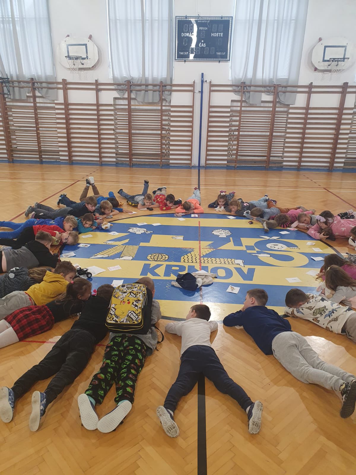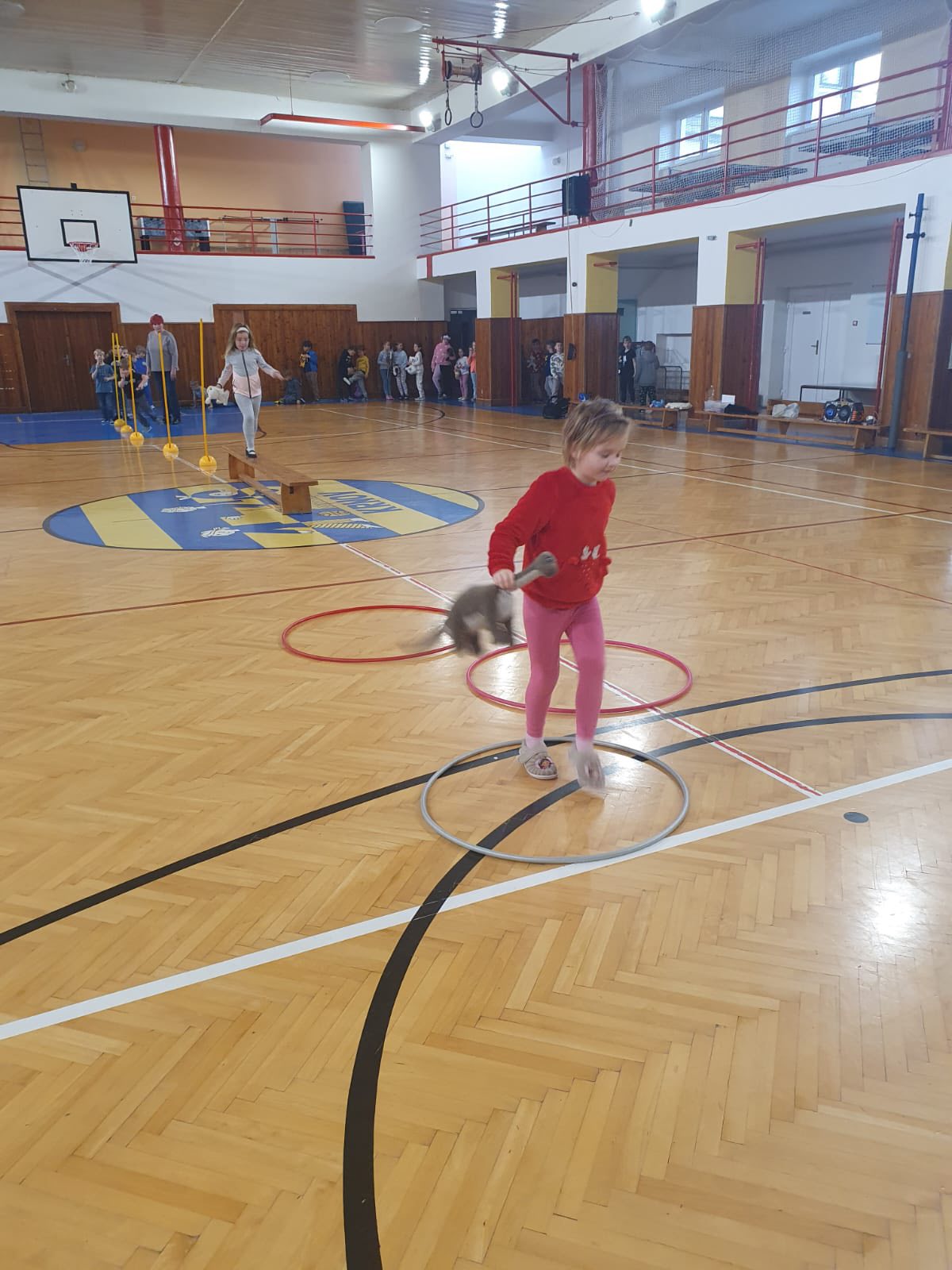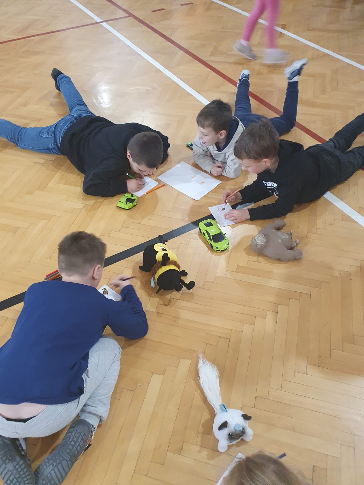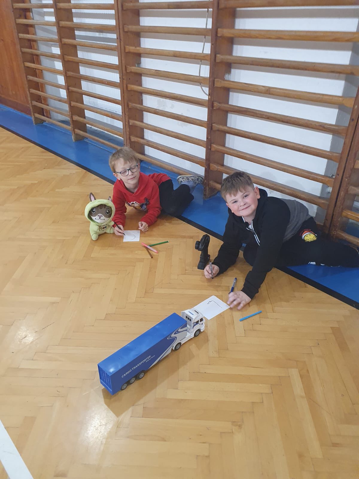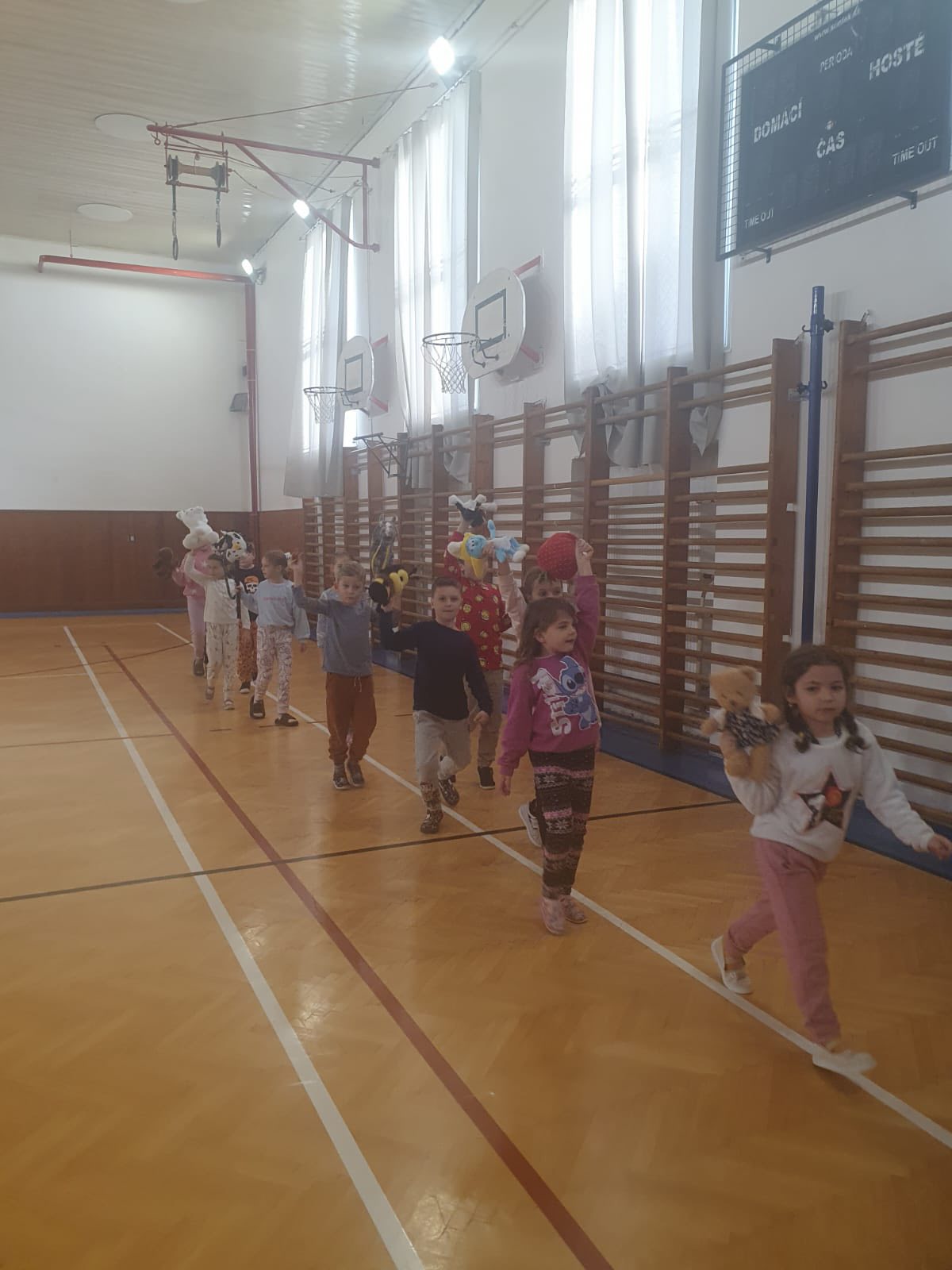 V tělocvičně nejprve své hračky představili a potom s nimi soutěžili, plnili úkoly, kreslili a tančili. Žákům se tato akce velmi líbila. ![]()
